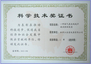 2010年,“一種凝汽器在線超聲波旋流除垢裝置”在電力系統(tǒng)200MW機(jī)組凝汽器安裝使用,填補(bǔ)了國內(nèi)空白,該項(xiàng)目于2012年獲得黑龍江省人民政府 “科學(xué)技術(shù)二等獎”,2013年,獲得國內(nèi)“首臺套獎勵”。